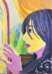 日本の御伽草子の一つである玉水物語を描きました。この物語は姫に恋をした狐が人間に化けて 姫の従者としてお仕えする話で、私は姫と狐である従者が紅葉狩りに行くシーンをイメージして描きました。一昨年のセンター試験にこの物語が出てきてとてもいい話だったので描こうと思いました。製作では自分が思った色を出すことと、髪を塗るのが難しかったです。