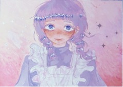 わたしの思う「かわいい」を体現したいと思い、紫とピンクで甘やかな夢の世界を表現しました。女の子の瞳とその周りにちらばる星々には銀色のマッキーを、赤く色づく頬や唇にはラメを用いているため、角度によって 光を反射しきらきらと輝きます。