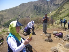 樹木の間に女峰と男体の姿、すぐ傍らに小さな雪渓が見られた。宇都宮ハイキングクラブの三人と出会って群馬と栃木の百名山について話を交わす。昼食後、11特に下山開始。尾根の先には階段の黒い筋と駐車場を囲む雄大な裾野と山並が見晴らされる。