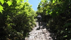 10時に女人堂着(6合目)、雪渓に入り、柔らかな雪に靴を蹴込んで登る。登山道に戻るとさらに傾斜が増し、20m余りの鎖場を含む険しい濡れ道をひたすらよじ登る。