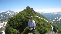 鎖場を4カ処も乗り越え、最初のピーク地蔵峯(1707m)を経て、1時に隣の不動峯着。主峰の大日岳(1710m)は前日の降雨で道が崩れているとのことで断念、昼食とする。