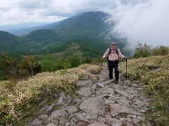 午前10時、 湯の丸山山頂に到着。 湯の丸山はその名の通り丸く穏やかなよ山容が特徴で、 下から見ると簡単に登れそうでしたが、 登山道は大きな石のガレ場が続き、思った以上に大変でた。 頂上は大勢の登山客で賑わい、 道標を入れて記念写真を撮るのも順番待ちです。 曇りの為360度のパノラマとはいきませんが、心地よい風が吹き抜け、爽やかな気分を味わう。
