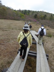 登山靴の紐を締めて9時に歩行開始。広く平らな道を散歩の気分である。曇り空で遠景は煙っている。その中で大きな男体山、真っ白な雪を冠る白根山、三角形の皇海山などが視野に入る。展望台の傍の岩の形から名付けられた象の鼻展望台から道は下りになって井戸湿原の木道を30分歩く。湿原と言っても水は少ない。間もなく横根山への登りにかかる。周りのツツジは、赤、白、紫、黄と桐生の水道山より多彩である。しかし赤はまだ蕾の状態である。最後の急な階段を登りきると横根山頂(1,373 m)に到着。雑木林に囲まれて眺望は効かない。枝の間に真っ白な白根山が望まれるだけである。