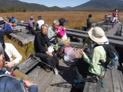 概ね1時間歩いて山の鼻に着、ここから自由行動として帰りは山の鼻発をpm1:00で鳩待峠着pm2:30をお願い。ここからが尾瀬ヶ原です、草原の草紅葉(そろそろ終わり)と周辺の山々(紅葉はまだ早い)、燧ケ岳を正面に眺めながら木道を歩いて牛首分岐(東電小屋及び竜宮小屋方面への分岐)で休憩昼食。雲一つない大きな青空、帰路は至仏山を正面に眺めながらの山の鼻に戻り、pm1:00に出発してpm2:30鳩待峠着、尾瀬保護財団が交通手段・経路・経費・宿泊地等アンケートを受け取り帰路に向かう。