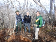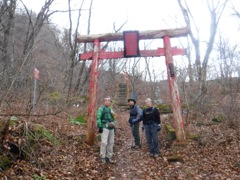 ここから石積の急登。そこで3名の白装束の修験者がいました。ここは黒髪山神社の信仰の山でその信者の人が年一度の祭りを行っておりました。その祭りに合えた幸運感を感じつつ登って行きました。岩場の鉄ハシゴ3ヶ所を経て、一気に黒髪山神社のある山頂に9:30到着。プレハブ社、石碑、石像が並ぶ信仰の山でした。登り始めは曇っていて寒さを感じていましたが、頂上に着くと太陽が顔を出し暖かく感じられる様になり伊香保面の素晴らしい展望を見る事が出来ました。少し休憩し9:45頂上を出発。登山口には10:35着。10:40には出発し途中伊香保の湯に入る予定でしたが少人数でしたのでこのまま桐生に向かおうとすぐに意見がまとまり風呂には入らず、バスで昼食を取り12:30には桐生倶楽部に着いてしまいました。当初の計画よりも相当早く着いて、忘年会の開催の確認。歩く会世話人会の打合わせの日時を決め散会し家路に着きました。
