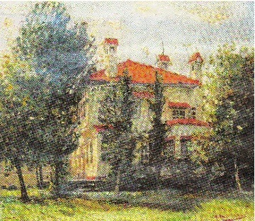 東京美術学校の黄金時代、岡田三郎助に学び、洋画の近代性を桐生に伝えた牧島要一の1936年の作品。ほかに同じ方向からもっと近づいて描かれた作品や正門から見た絵もあり、桐生倶楽部の建物はかなり気に入った対象であったと思われる。柔らかい光あふれる情景は、改修により面ざしを変える前の建物の雰囲気をいまに伝えてくれる。 |